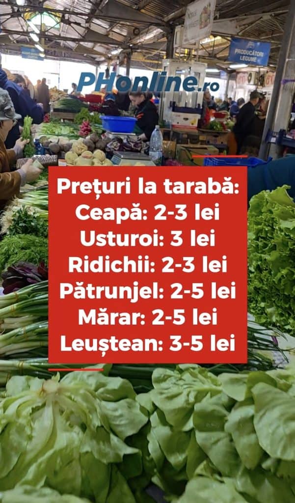 De exemplu, o legătură de leuștean poate fi cumpărată la un preț care variază între 3 lei și 5 lei. Ceapa se vinde cu 2 lei cel mai ieftin, mărarul, la fel. Usturoiul pleacă de la prețul de 3 lei, ridichiile, de la 2 lei legătura. Cu frunze sau fără.