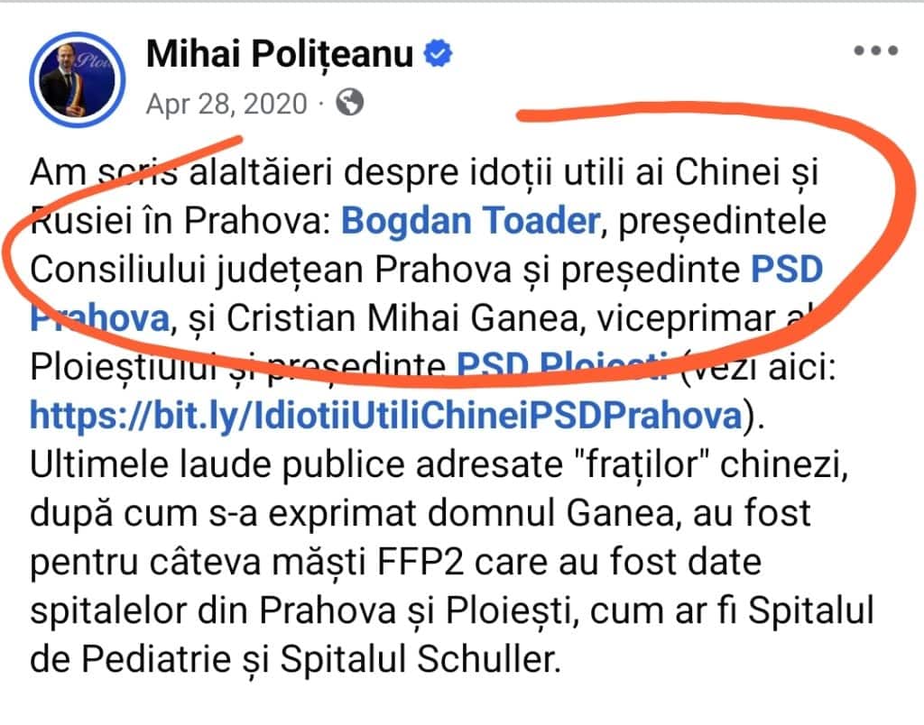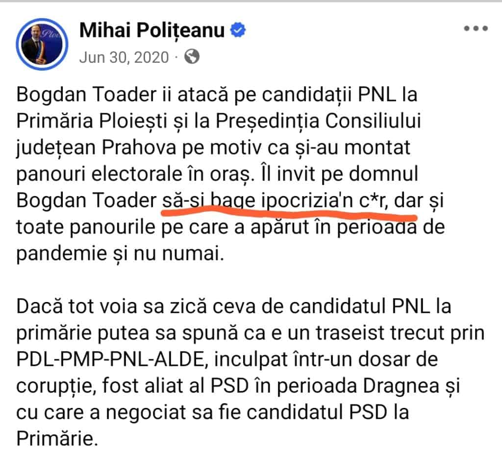 Memoria internetului nu iartă, iar pentru Mihai Polițeanu, arhiva personală de postări a devenit cel mai mare inamic al noii sale imagini de primar „conciliant”. Dacă astăzi îl vedem pe edil apelând disperat la sprijinul liderilor PSD pentru proiecte pe care le numește „de suflet”, în urmă cu ceva timp, discursul său la adresa lui Bogdan Toader (președintele PSD Ploiești) era desprins din manualele de atac la persoană, folosind un limbaj care astăzi face orice colaborare să pară o dovadă de ipocrizie crasă.