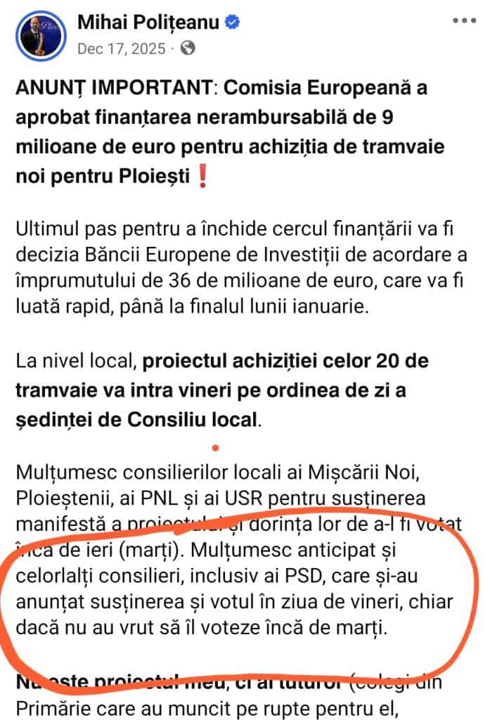 ​Este de notorietate faptul că, atunci când Ploieștiul a fost sufocat de gunoaie sau când termoficarea a intrat în colaps, soluțiile nu au venit din viziunea „independentă” a primarului, ci din intervenția directă a structurilor conduse de PSD. Însă culmea ironiei apare la proiectele fanion ale lui Mihai Polițeanu: achiziția de tramvaie și celebra lizieră de la UPG.