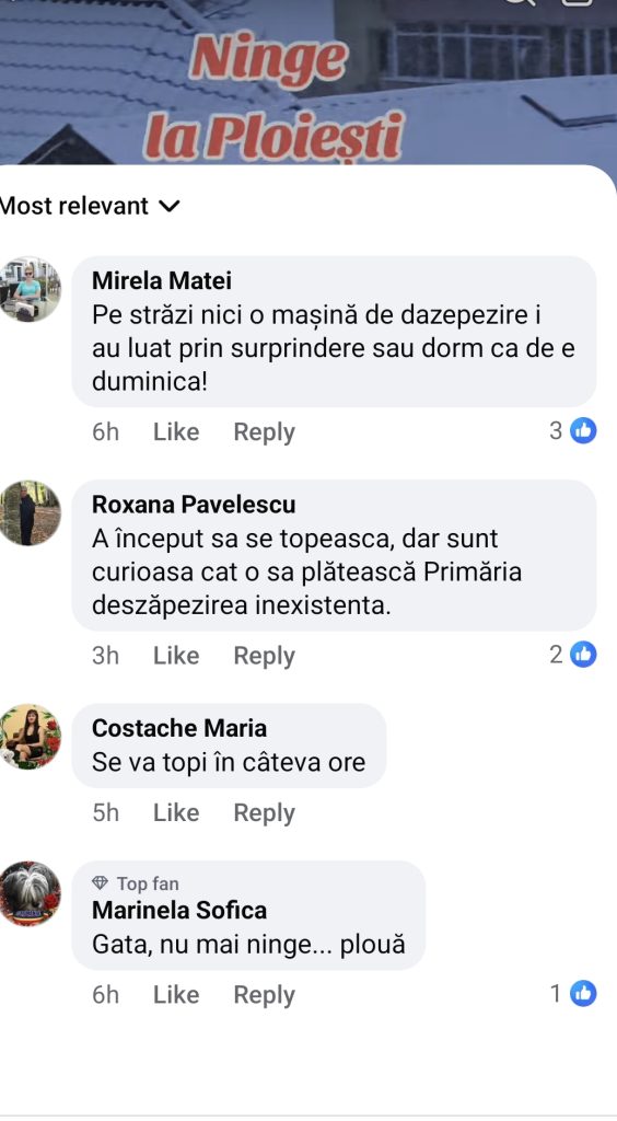 Pe reţelele de socializare, numeroşi ploieşteni s-au plâns că nu au văzut utilajele de dezăpezire în teren.