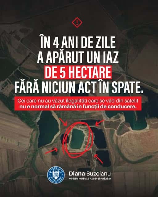 „Uitați-vă la poza de mai jos. Iazul încercuit nu exista acum 4 ani. 4 ani s-a săpat un crater, fără acte, pe 5 hectare. Un crater de unde au fost mii de camioane scoase cu nisip și balast, materiale care apoi au fost vândute și s-a obținut un venit ilegal de milioane și milioane de lei”, a declarat ministra, făcând referite la fotografia de mai jos.