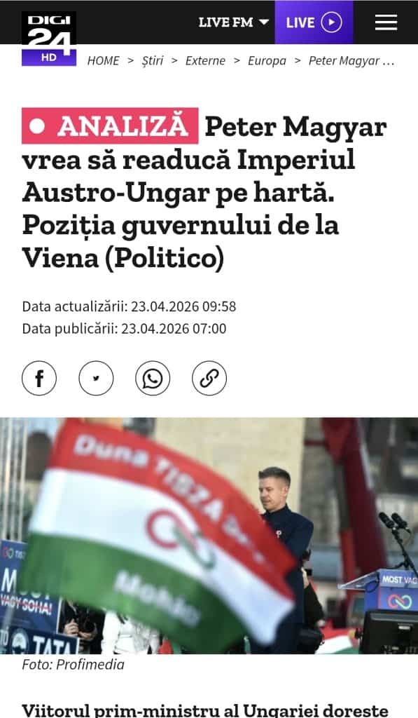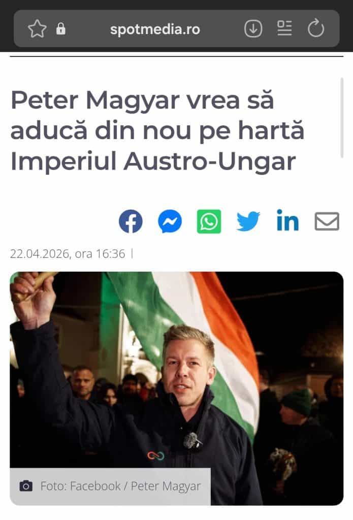 Deși Tonciuc îl prezintă ca pe un salvator al democrației, publicațiile internaționale și declarațiile recente (vezi captura de ecran din Spotmedia/Digi24) îi conturează lui Peter Magyar o imagine mult mai controversată. Titlurile sunt șocante: „Peter Magyar vrea să aducă din nou pe hartă Imperiul Austro-Ungar”.