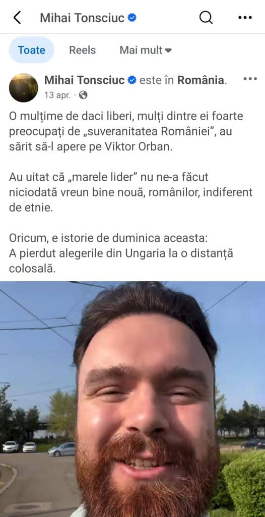 Pe lângă entuziasmul pentru Magyar, Tonciuc nu a ratat ocazia să îi ia în derâdere pe românii care mai vorbesc despre „suveranitatea României”, numindu-i ironic pe rețelele sociale „daci liberi”.