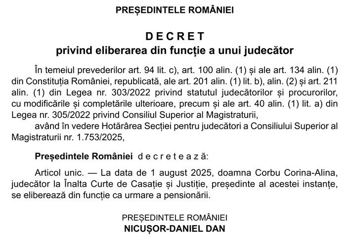 Momentul vacantarii functiei s-a produs odata cu publicarea decretului de pensionare a Corinei Corbu in Monitorul Oficial, adica 1 august 2025, Corbu plecand la pensie cu o luna si jumatate inainte sa isi incheie mandatul.