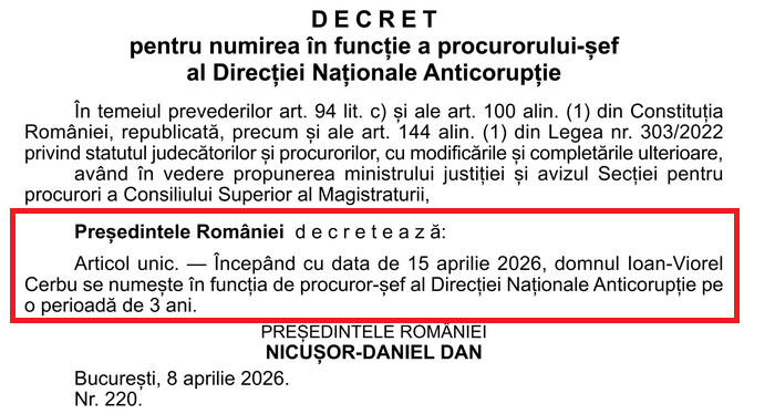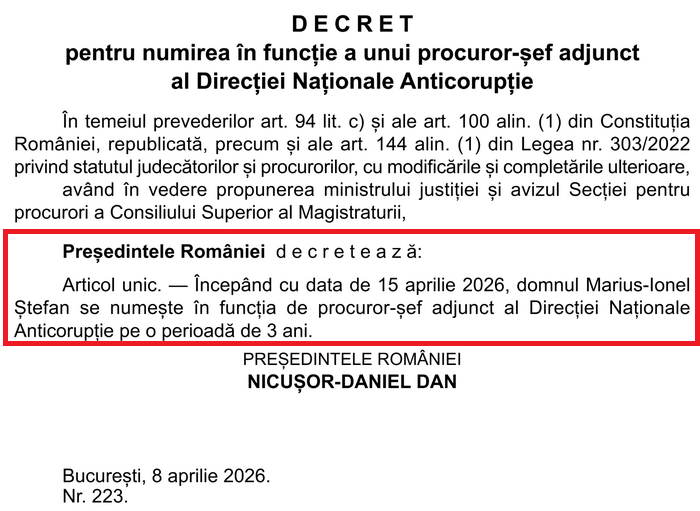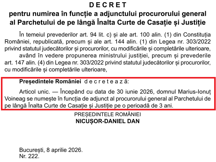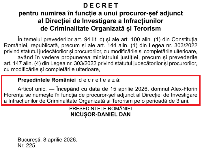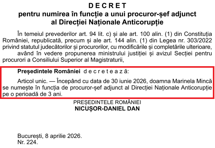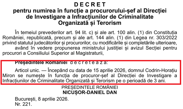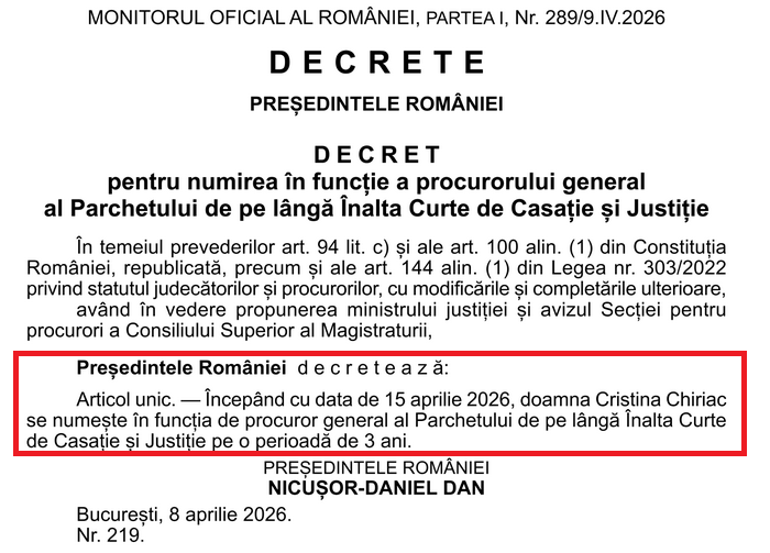 În Monitorul Oficial al României au fost publicate joi, 9 aprilie 2026, decretele lui Nicușor Dan de numire în funcții a șefilor și adjuncților marilor parchete (vezi facsimil). Ne referim la numirea Cristinei Chiriac (foto stânga) în funcția de Procuror General al României, a lui Marius Voineag în funcția de adjunct al PICCJ, a lui Viorel Cerbu (foto centru) în funcția de procuror șef al DNA, a Marinelei Mincă în funcția de procuror-șef adjunct al DNA, a lui Marius-Ionel Ștefan în funcția de procuror-șef adjunct al DNA, a lui Codrin-Horațiu Miron (foto dreapta) în funcția de procuror-șef al DIICOT și a lui Alex Florența în funcția de procuror-șef adjunct al DIICOT.