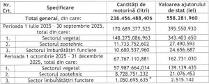– 395.550.930 lei – trimestrul III 2025 – pentru un număr total de 17.259 beneficiari cu o cantitate de 170.689.377,525 litri motorină;