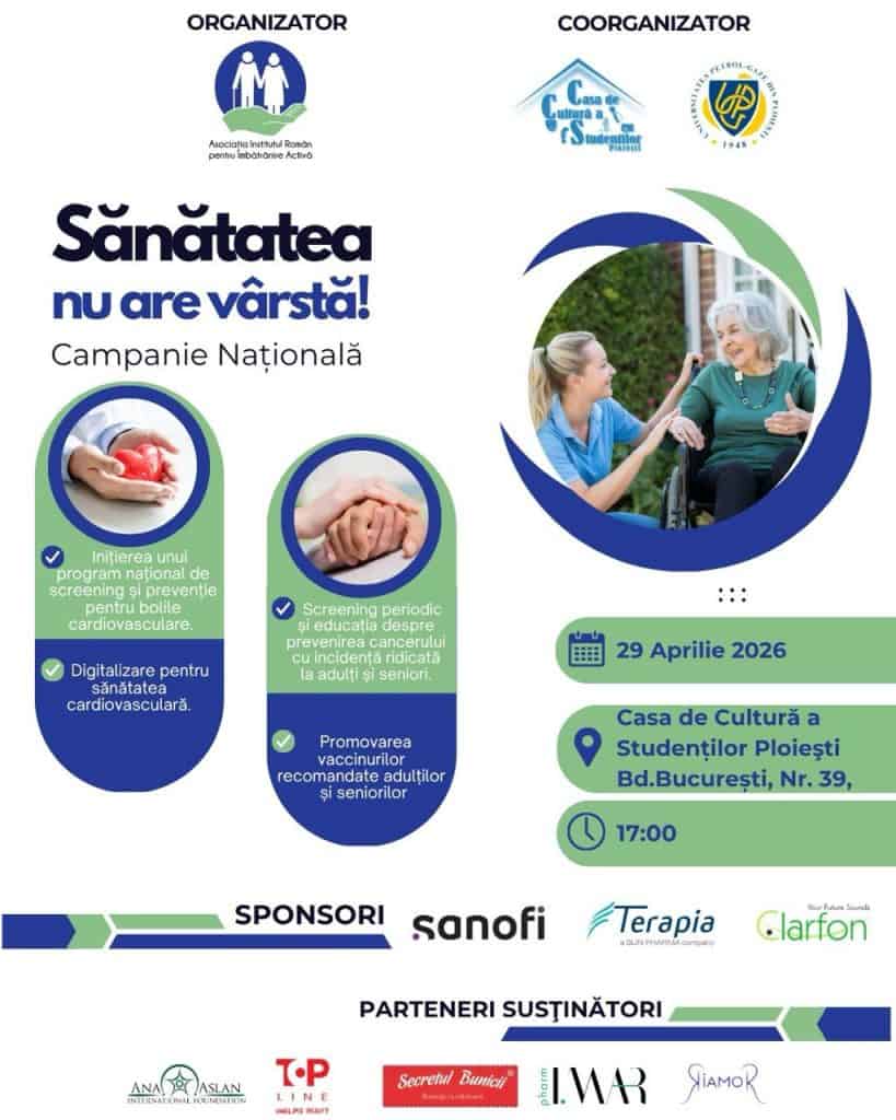Asociația Institutul Român pentru Îmbătrânire Activă organizează campania națională „Sănătatea nu are vârstă”, un proiect dedicat prevenirii și educației medicale pentru toate categoriile de vârstă. Evenimentul din Ploiești va avea loc pe data de 29 aprilie 2026, începând cu ora 17:00, la Casa de Cultură a Studenților Ploiești.