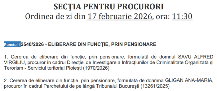 Altfel, pe ordinea de zi a aceleași ședințe a Secției pentru procurori a CSM figurează și eliberarea din funcție prin pensionare a procuroarei Ana-Maria Gligan de la Parchetul Tribunalului București.