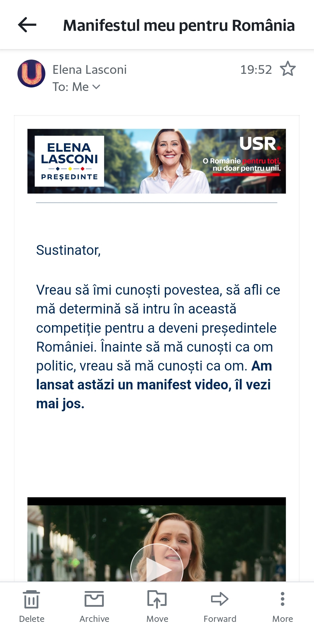 Astăzi, am primit un email nesolicitat care conținea un clip publicitar politic, însoțit de un mesaj care promova candidatul partidului USR la alegerile prezidențiale.